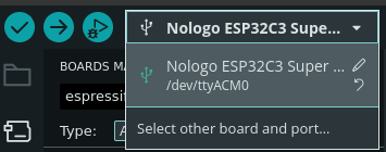 - In the Arduino IDE toolbar, select the board and port from the dropdown.